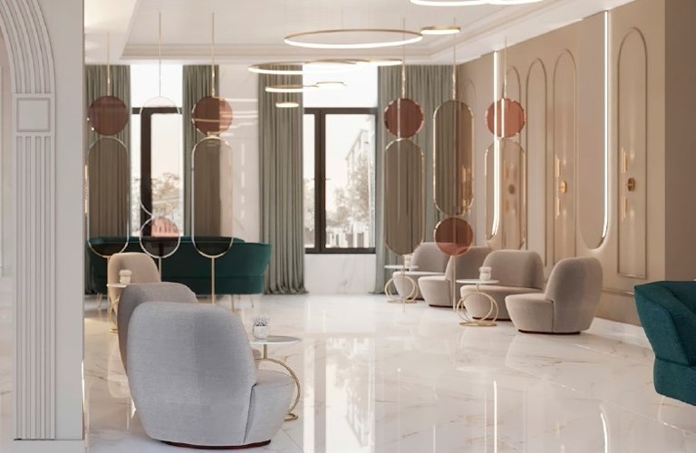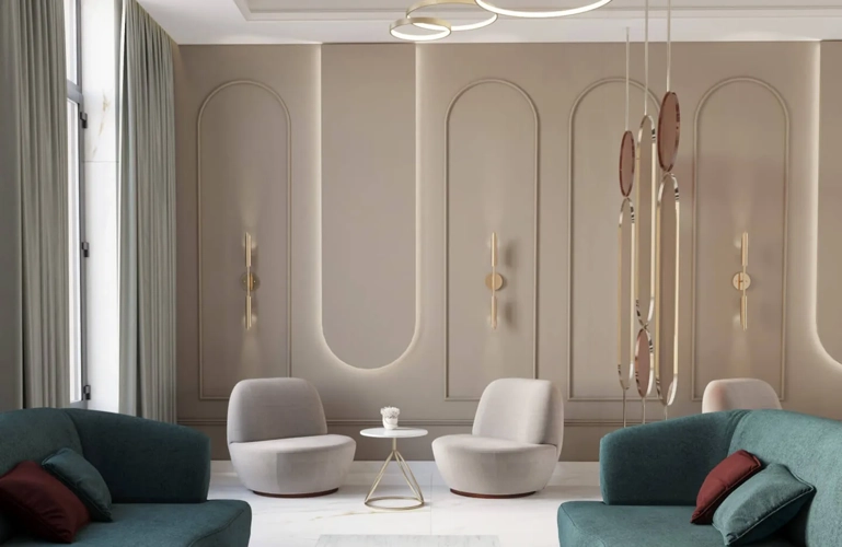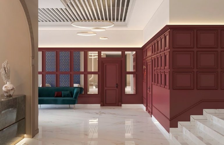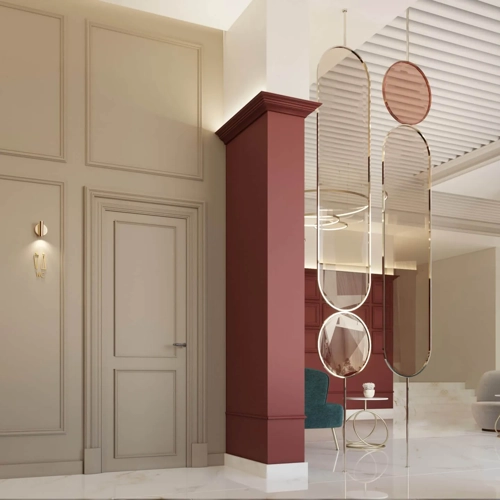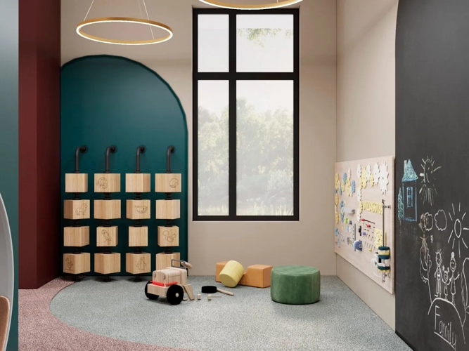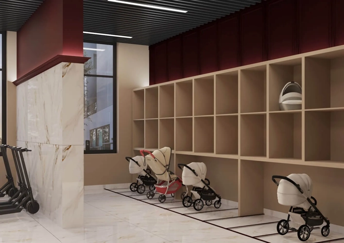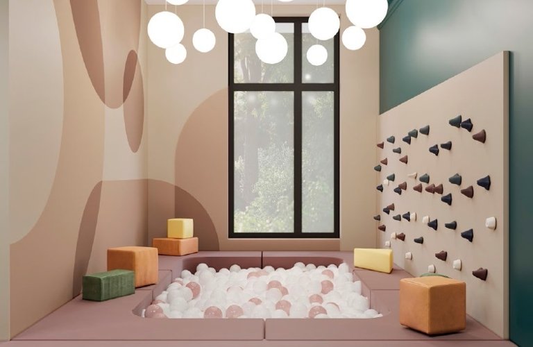 В холле вас встречает дружелюбный ресепшен с мраморной стойкой, мягким светом и изящной лепниной. Для жителей предусмотрены коворкинг, библиотека и зона отдыха с камином, а для детей — игровая комната с горками, стеной для подъёмов, сухим бассейном и творческими панелями.