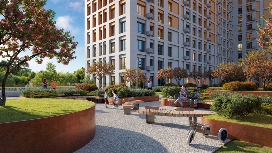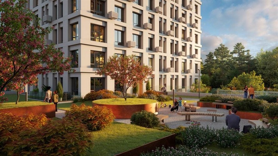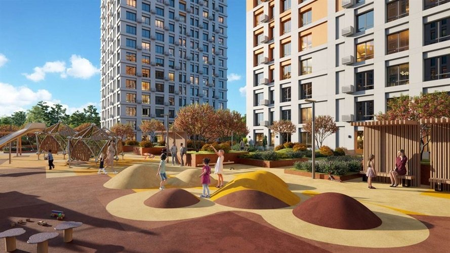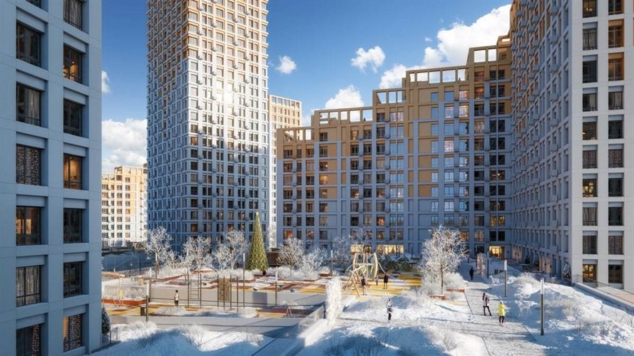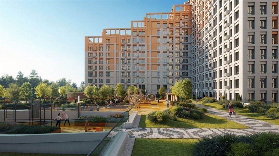 Двор без машин с тихими зонами для йоги и медитации, и шумными площадками для игр и праздников. Спортивные тренажёры, беговые маршруты и беседки создают пространство для разных настроений. Дома спроектированы с учётом розы ветров и движения солнца, поэтому во дворе достаточно солнца и безветренно.